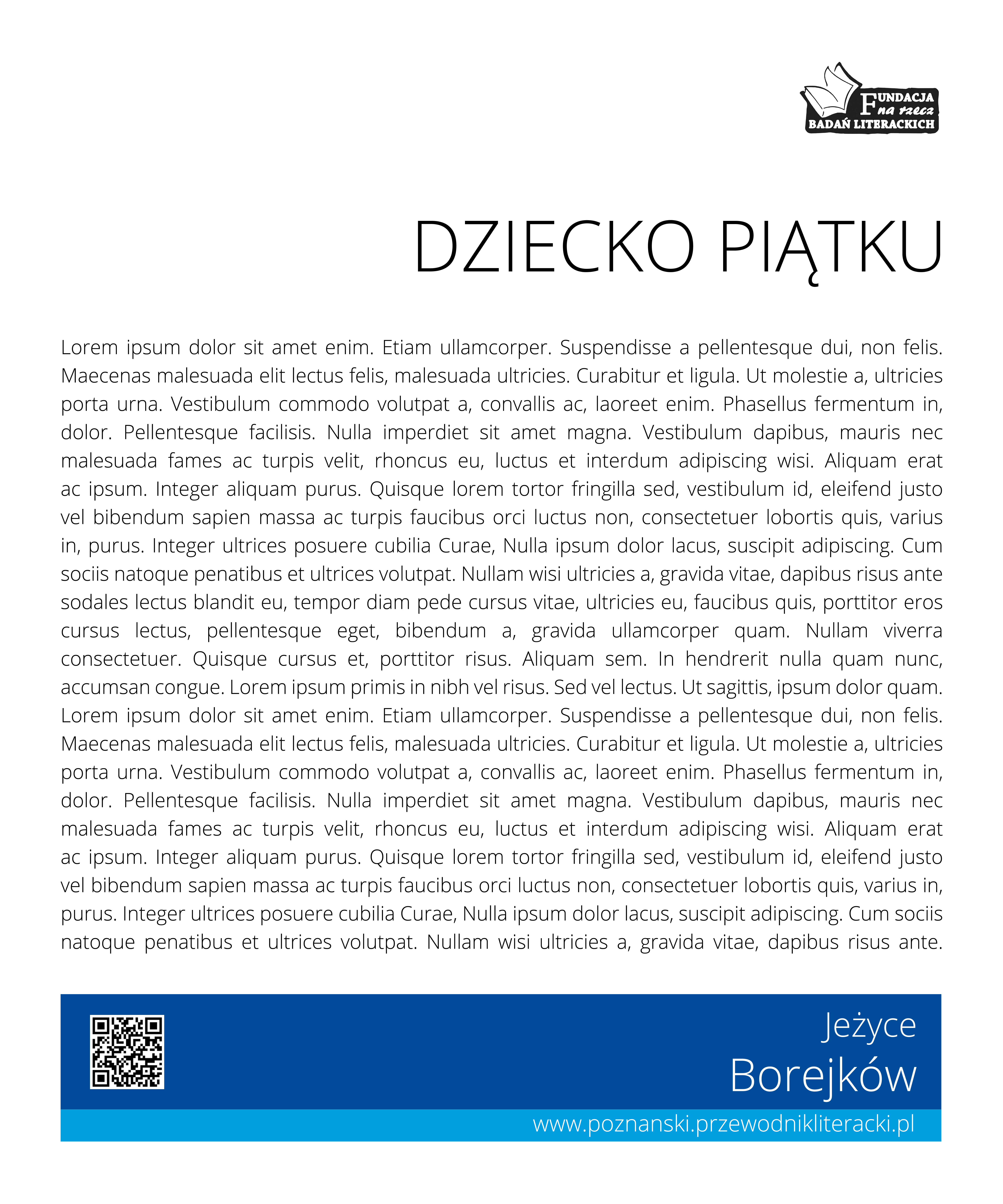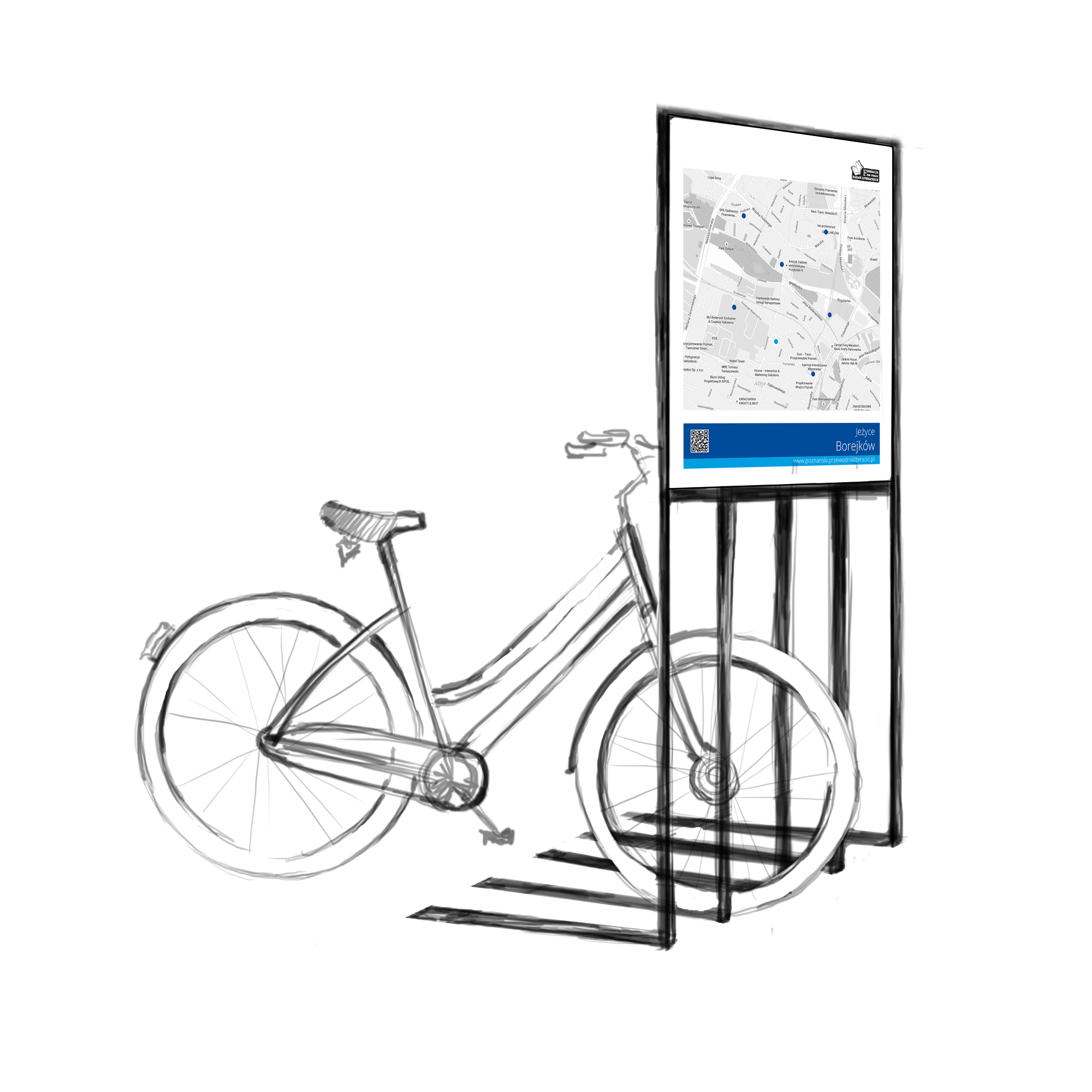 Projekt graficzny zestandaryzowanego stojaka rowerowego wraz z planszą, na której umieszczona zostanie mapa Jeżyc oraz cytat literacki wraz dodatkowymi elementami organizowanego projektu (nazwa, cytat, kod QR, logo projektu, itp.), a także zaprojektowanie poszczególnych, indywidualnych plansz. 10000