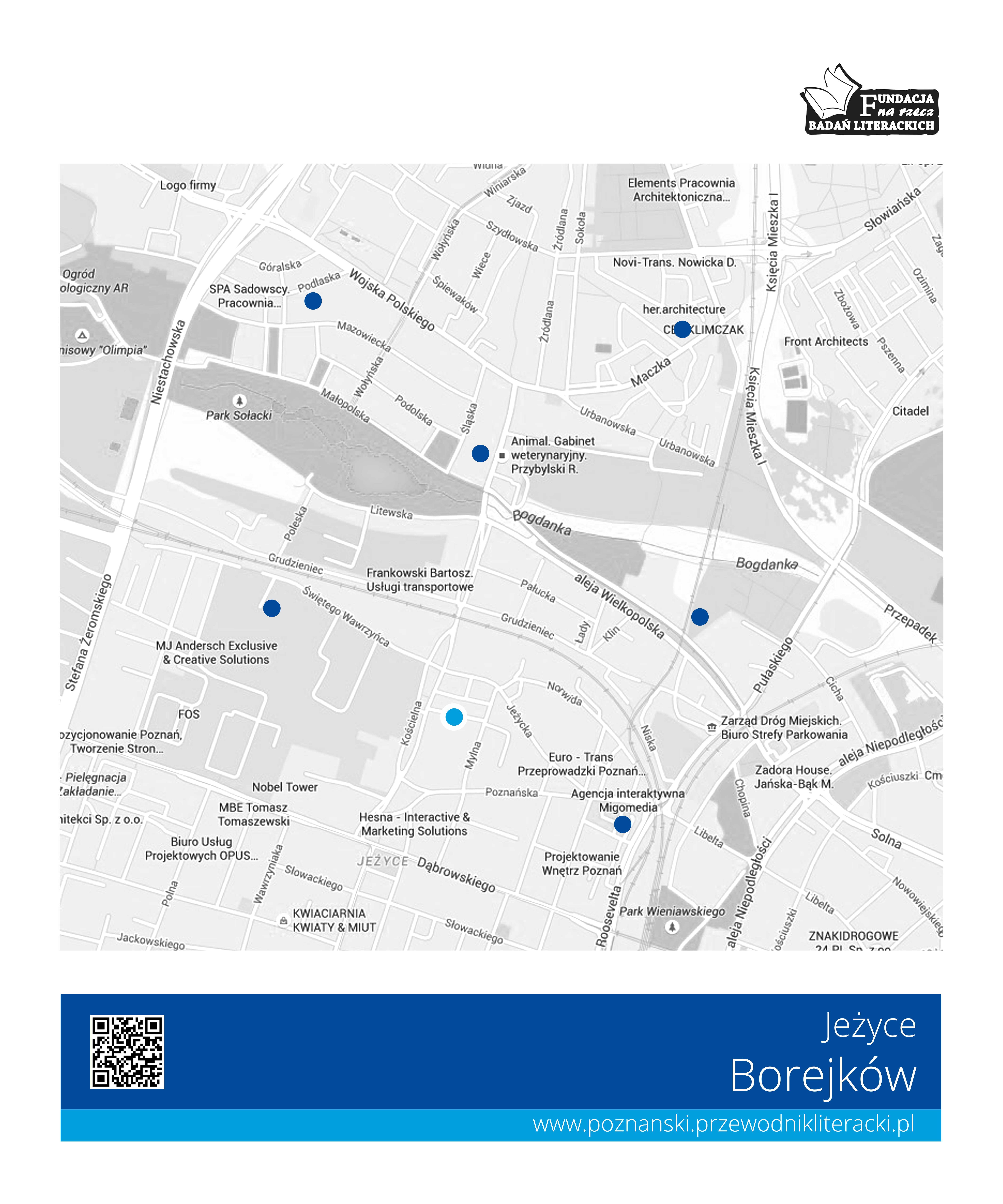 Poszczególne stojaki rowerowe z planszami informacyjnymi umieszczone będą w pobliżu miejsc opisywanych na kartach powieściowego cyklu Małgorzaty Musierowicz i utworzą siatkę miejsc na mapie Jeżyc, które miały znaczenie dla bohaterów powieści. Wskazać można przykładowo następujące lokalizacje: ul. Roosvelta 5 (dom rodzinny Borejków), Rondo Kaponiera (Wigilia pod Rondem), ul. Słowackiego (kamienica, w której mieszkała pisarka), ul. Mickiewicza (szpital Raszei), ul. Kochanowskiego (komenda policji), ul. Polna (szpital położniczy), ul. Krasińskiego (mieszkanie Idy), ul. Słowackiego 18 (mieszkanie Cesi), park Sołacki (miejsce randek młodych Borejków), itp. itd.